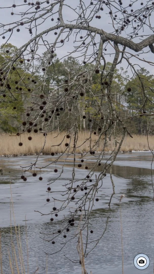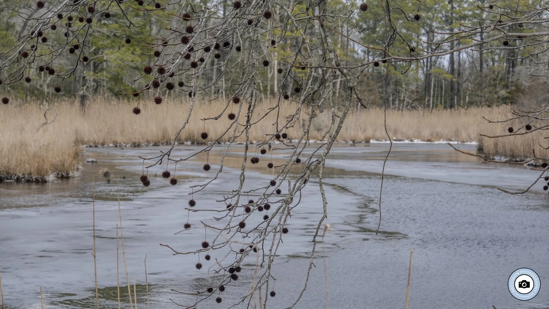 Mid‑range view of overhanging branches studded with round seed pods, reaching out across the frozen surface of the creek while distant reeds and trees create a soft, layered backdrop.