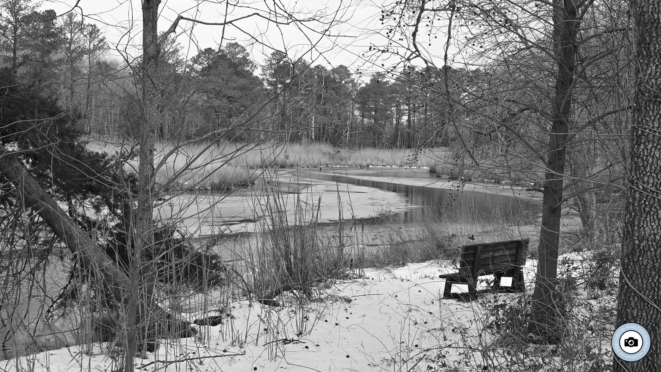 Black‑and‑white phone photo of a secluded bench in the snow, tucked just off the water’s edge and framed by bare trees, inviting the viewer to imagine sitting and listening to the frozen marsh.
