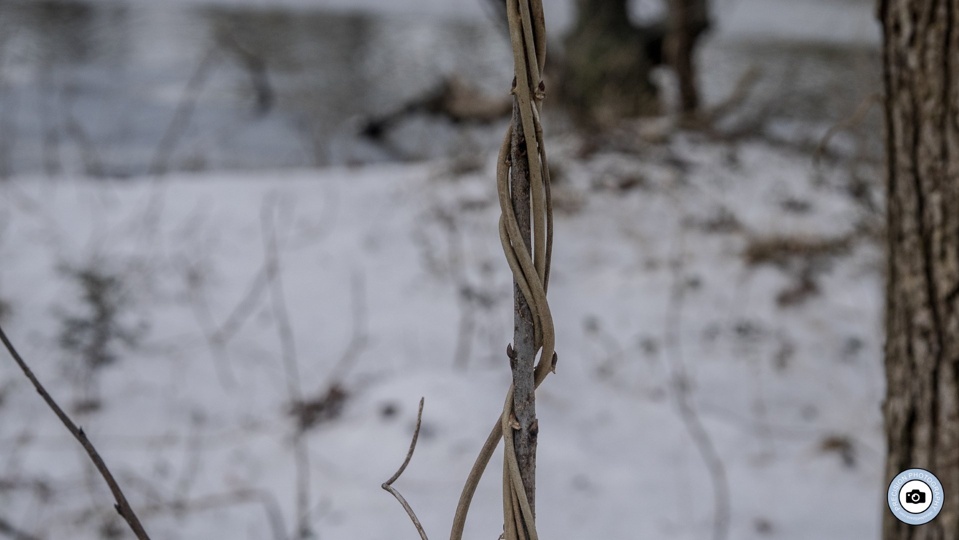 Close‑up of a twisting vine wrapped tightly around a slender trunk, with the snowy ground and blurred creek in the background, emphasizing the graphic lines and natural patterns of the winter woods.