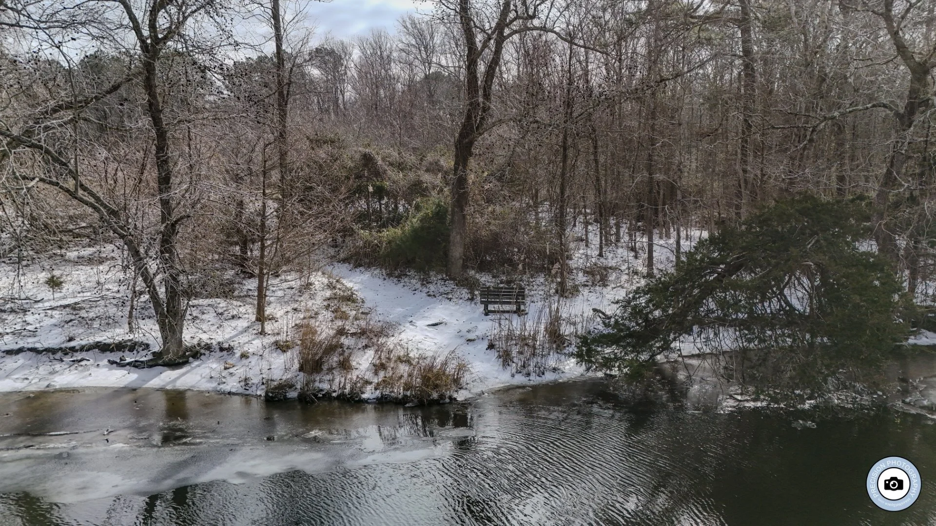Drone image framing a small snowy clearing beside the creek, where a lone bench and a leaning evergreen meet the reflective, partially frozen water, creating a quiet focal point within the wider winter landscape.